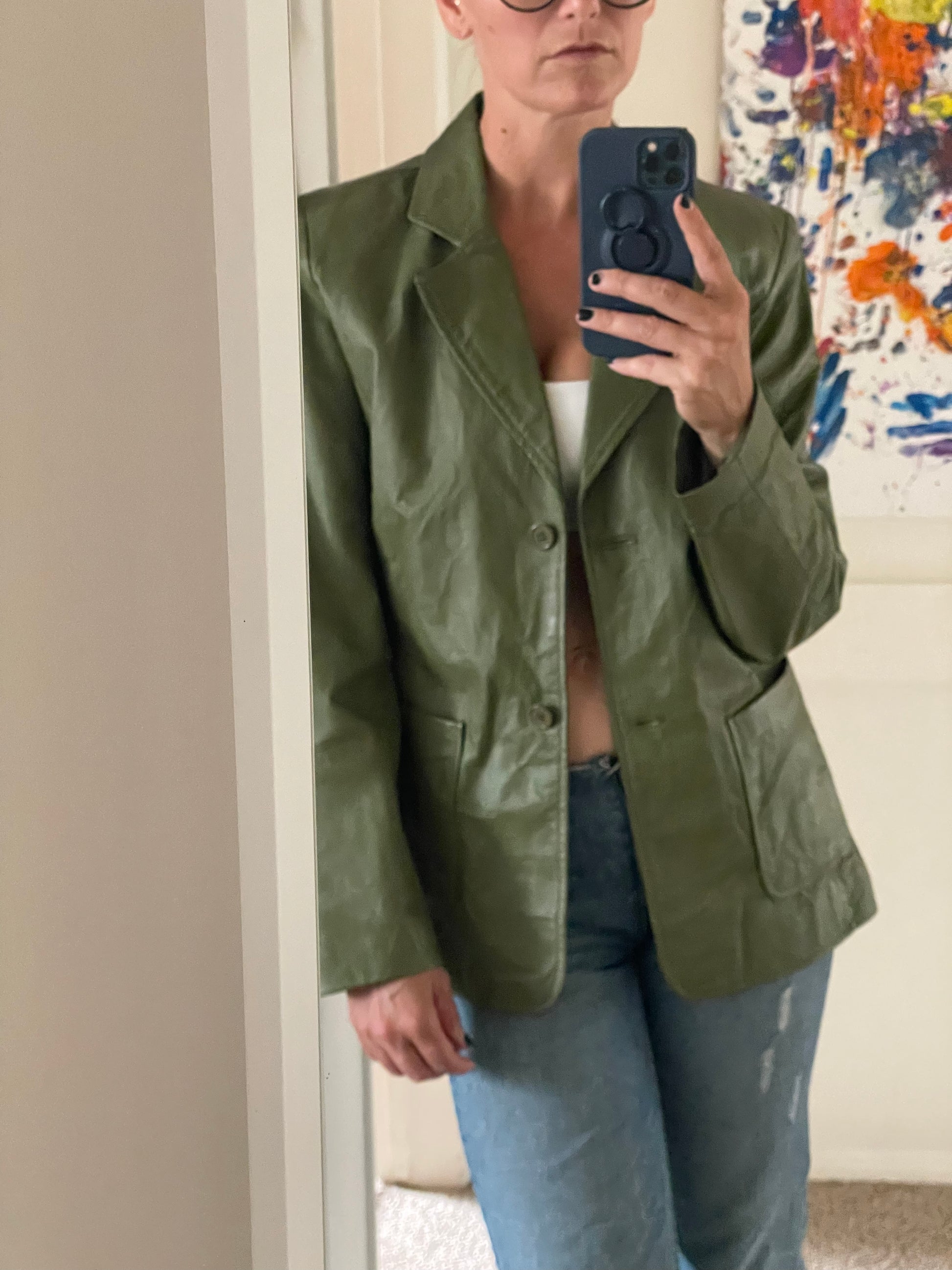 I just love jackets I can wear with bras or sweaters. This baby translates to all year round. And what a green color!